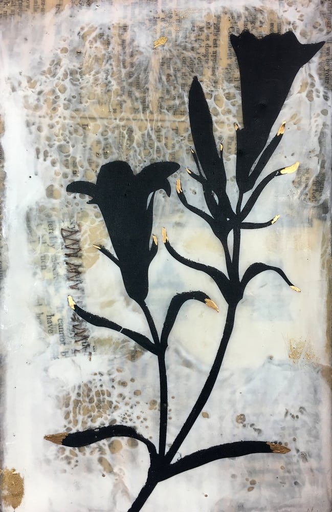 Original encaustic painting with image transfer. Artwork is 7.5” x 4.5” and includes gold leaf and metal beads.